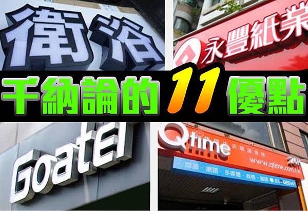 千那論是將透光招牌效果與傳統立體金屬字兩大優點結合在一起的廣告材料素材,專門為提高招牌品質和提昇企業形象而生產的立體透光招牌材料,可依客戶實際需要製作,易搭配建築物之特色展現出多變化的視覺效果亮麗的外表、色澤、質感、變化豐富,日夜表現效果一致,多變化的尺寸,可適用於任何大小的商店招牌。