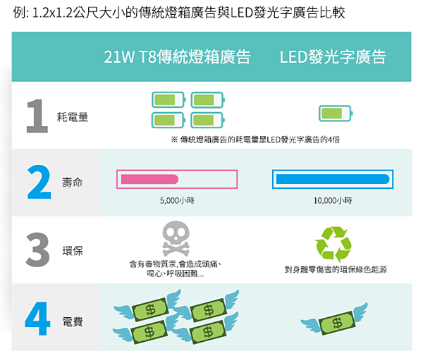 他與傳統燈箱廣告有非常大的差別,像是耗電量大小,壽命長短,這些也影響著成本(如下圖比較表)